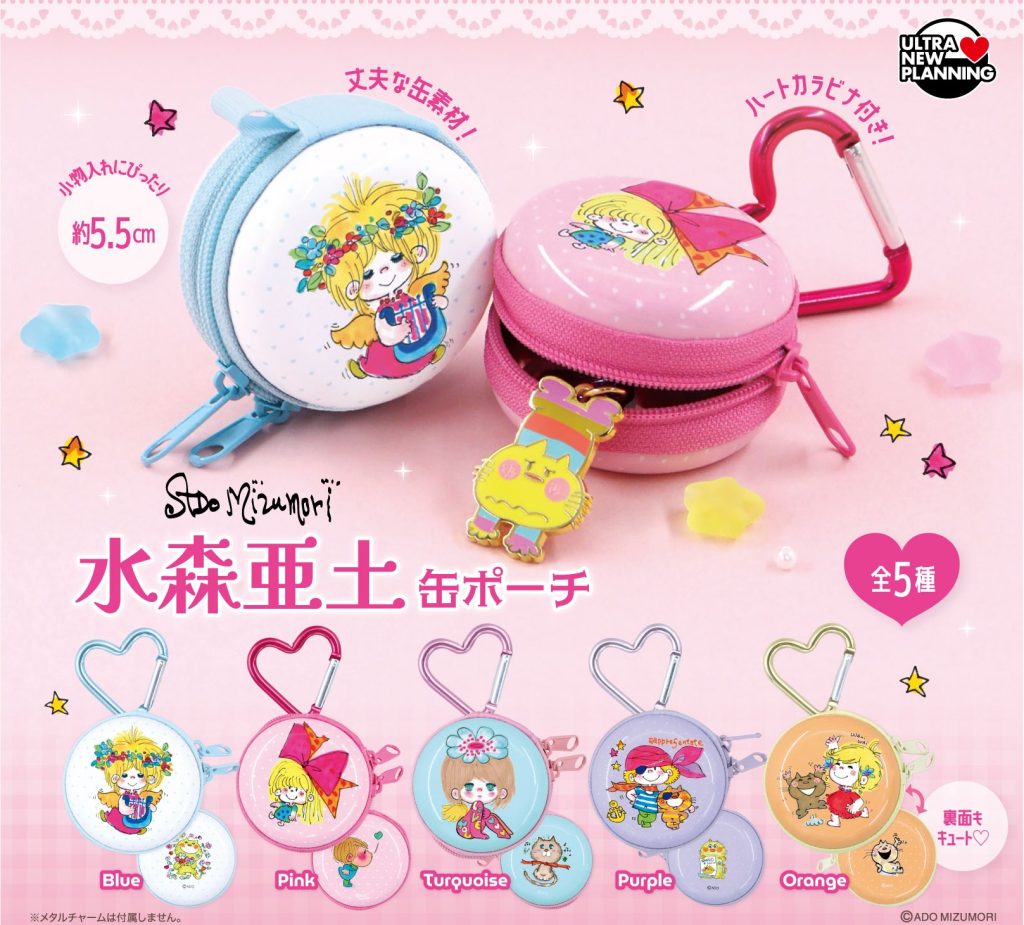 水森亜土が描く可愛いイラストが缶ポーチで登場!ハートのカラビナ付きなのでいろんなところに付けられます。
